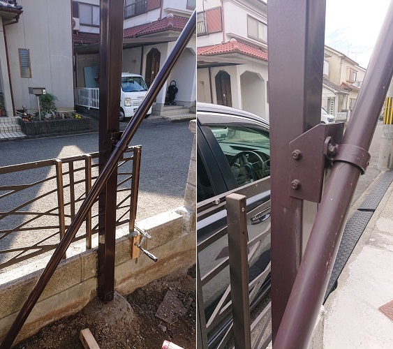 ガレージの支えにする横方向の角パイプが斜めになっていて、支柱にボルトで直接付けられなく、上下で挟む形で固定しました。