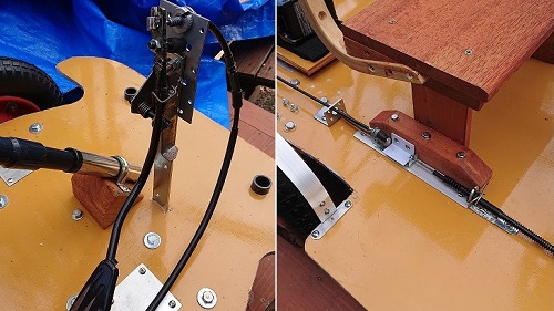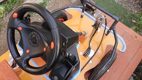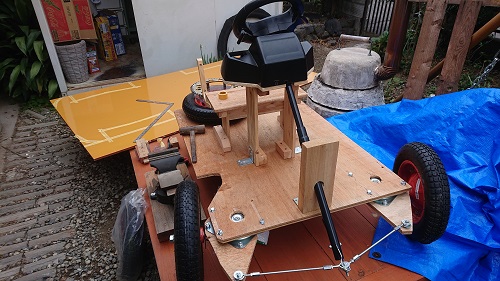 ハンドル回転軸の取付角度(塩ビパイプ部分)は、この画像より、もっと立てた方が、操舵しやすそうです。