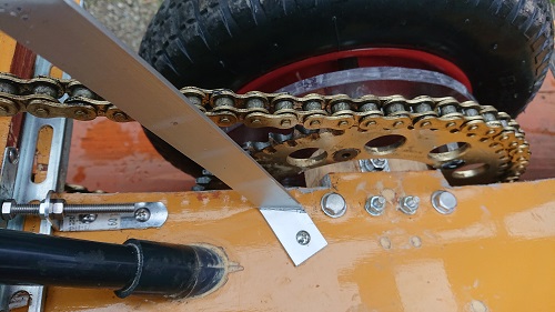 ドリブン側のスプロケットはバイク用のお古(チェーン520用49丁)を使う前提で進めていましたが、産業用のこのての軸穴一体型スプロケットは、520用はなく、50系では530用(幅太)しか生産していない様で、しかたなく、グラインダーでスプロケット幅を削ってつかいました(やればできるです)。