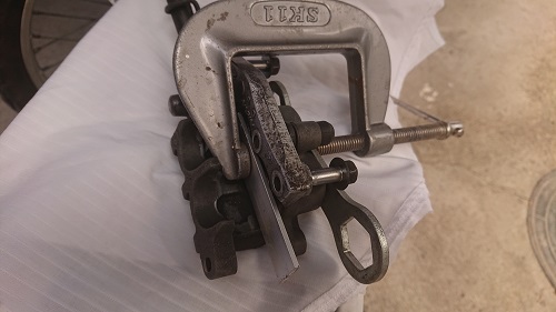 キャリパーは、プレスクランプを使って、キャリパーピンを押し戻しました。