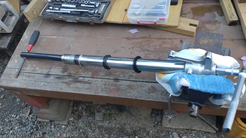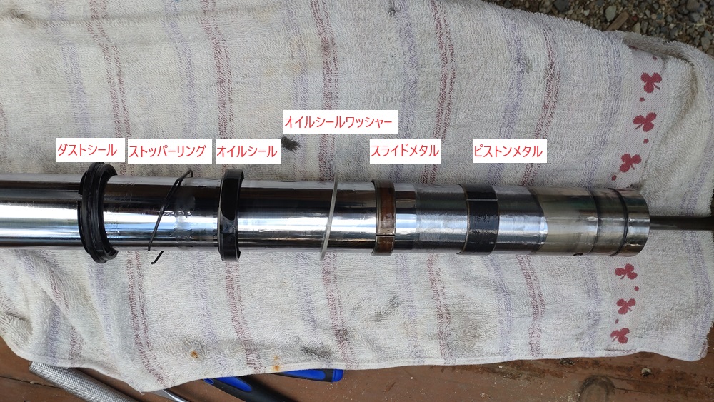 ダストシールを外し、ストッパーリングを丁寧にはずしてから、インナーチューブを何回か勢いよく引けば外れます。